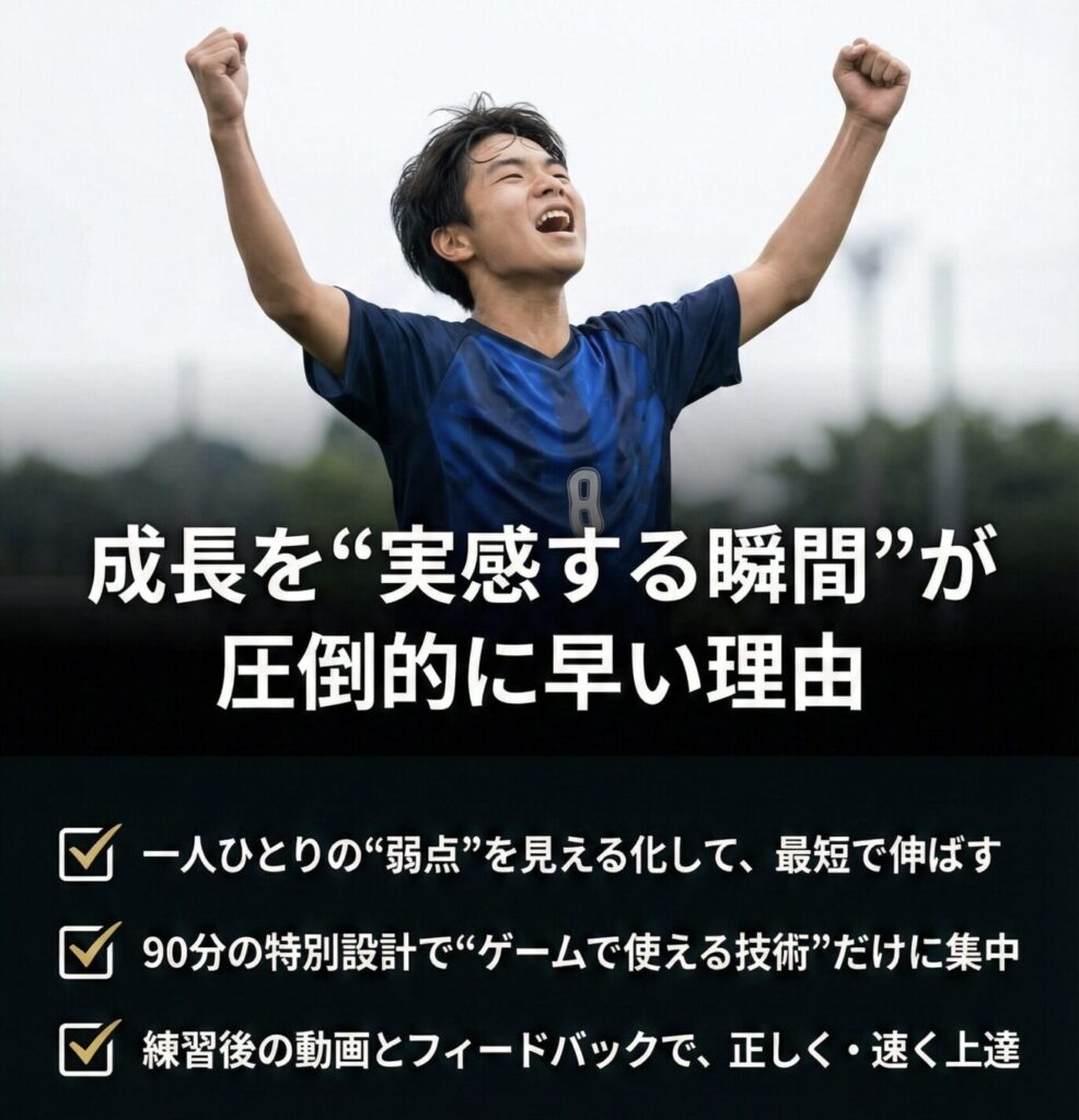 「強いシュートを打ちたい」「逆足でも蹴りたい」など、お子さんの課題を見極めて最短ルートで改善します。